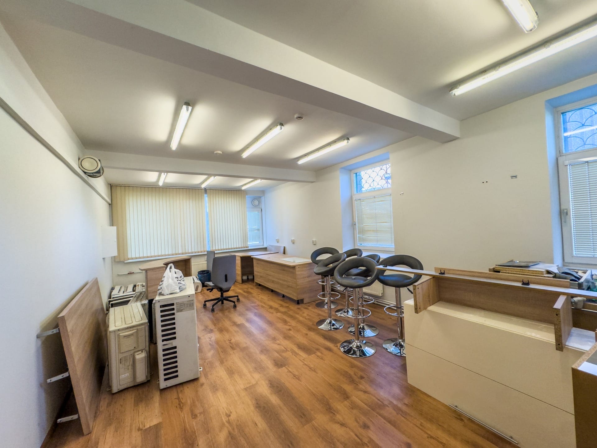 Telpā ir gatava apdare, griestu augstums ir vidēji 3 metri.