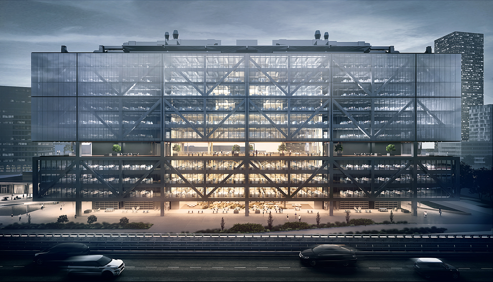 Nomniekiem pieejamas vidēji 1 autostāvvieta uz 20 m² (kopā 971 vieta). Papildu ērtības: 860 m² liela terase piektajā stāvā, multifunkcionālais centrs ar futbola laukumu uz jumta blakus ēkai, kā arī 2000 m² plaša kopstrādes vide pirmajā stāvā ar divām galvenajām ieejām un plašu ēdināšanas zonu.