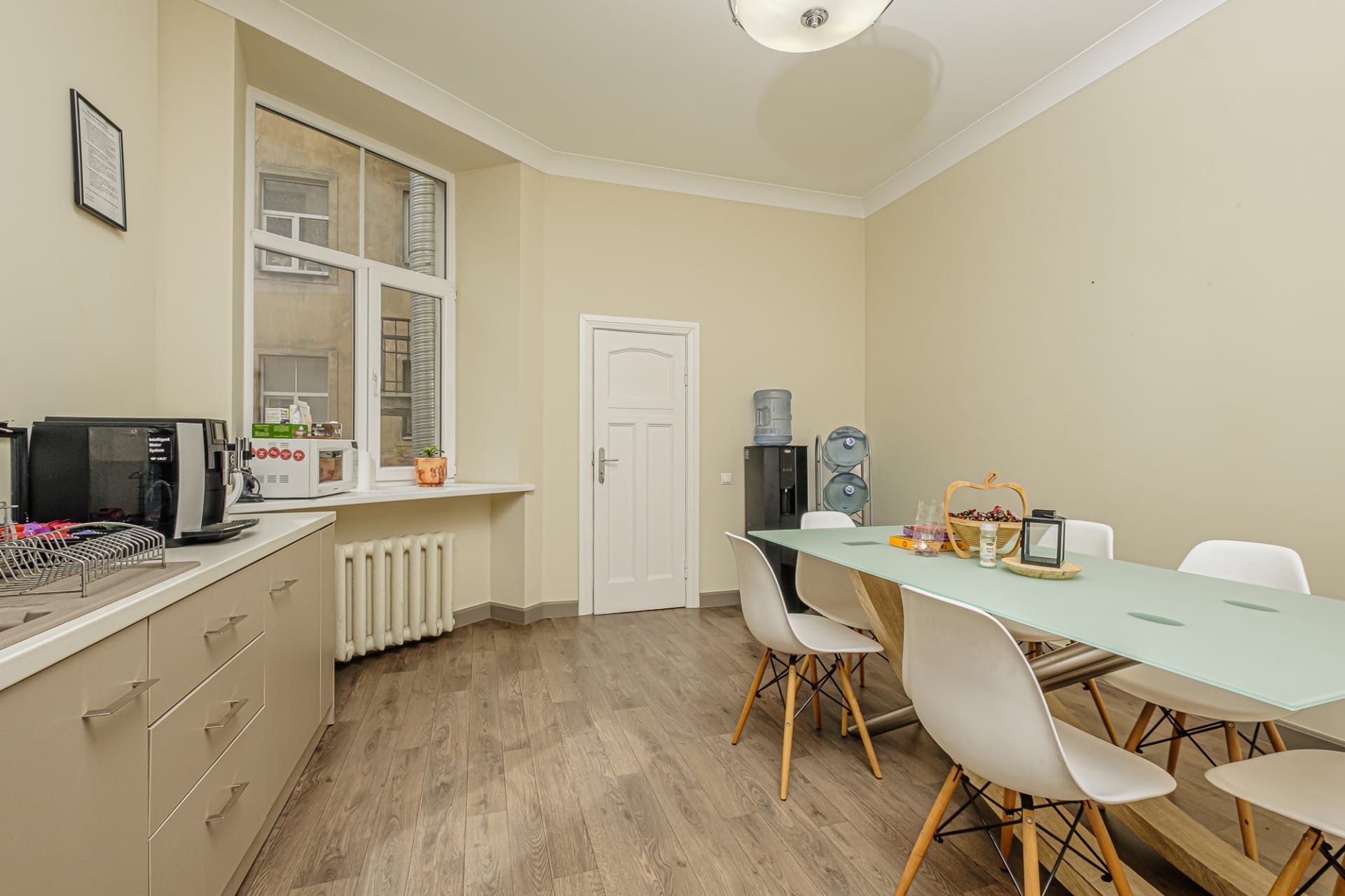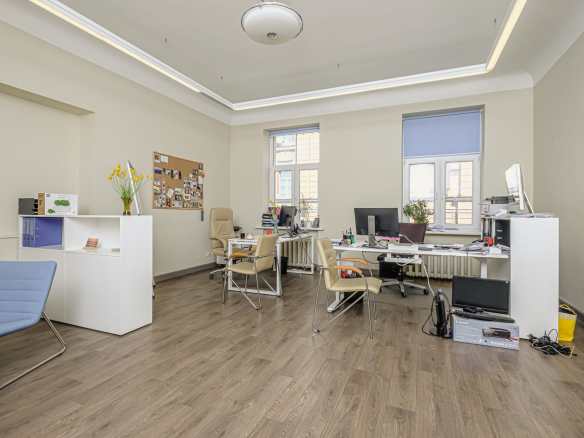 Telpu plānojums ir ērts un funkcionāls, iekļaujot četras plašas un gaišas biroja telpas, pilnībā aprīkotu virtuvi, nelielu saimniecības/uzglabāšanas telpu, WC un balkonu. Telpu griestu augstums ir līdz pat 3,3 metriem. Īpašumam papildus nāk klāt divas autostāvietas.
