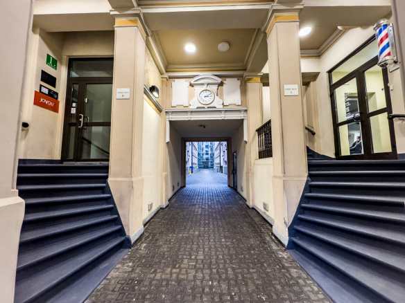 Telpā ir gatava apdare, PVC logs un griestu augstums ir vidēji 3 metri. Divi atsevišķi kabineti (skatīt plānu zemāk). Ir pieejami sānmezgli — koplietošanas.