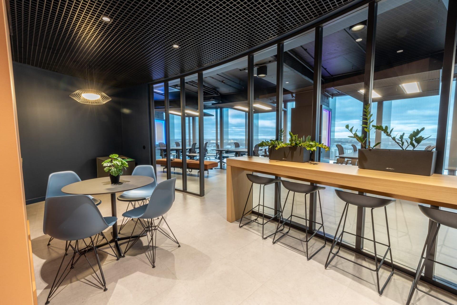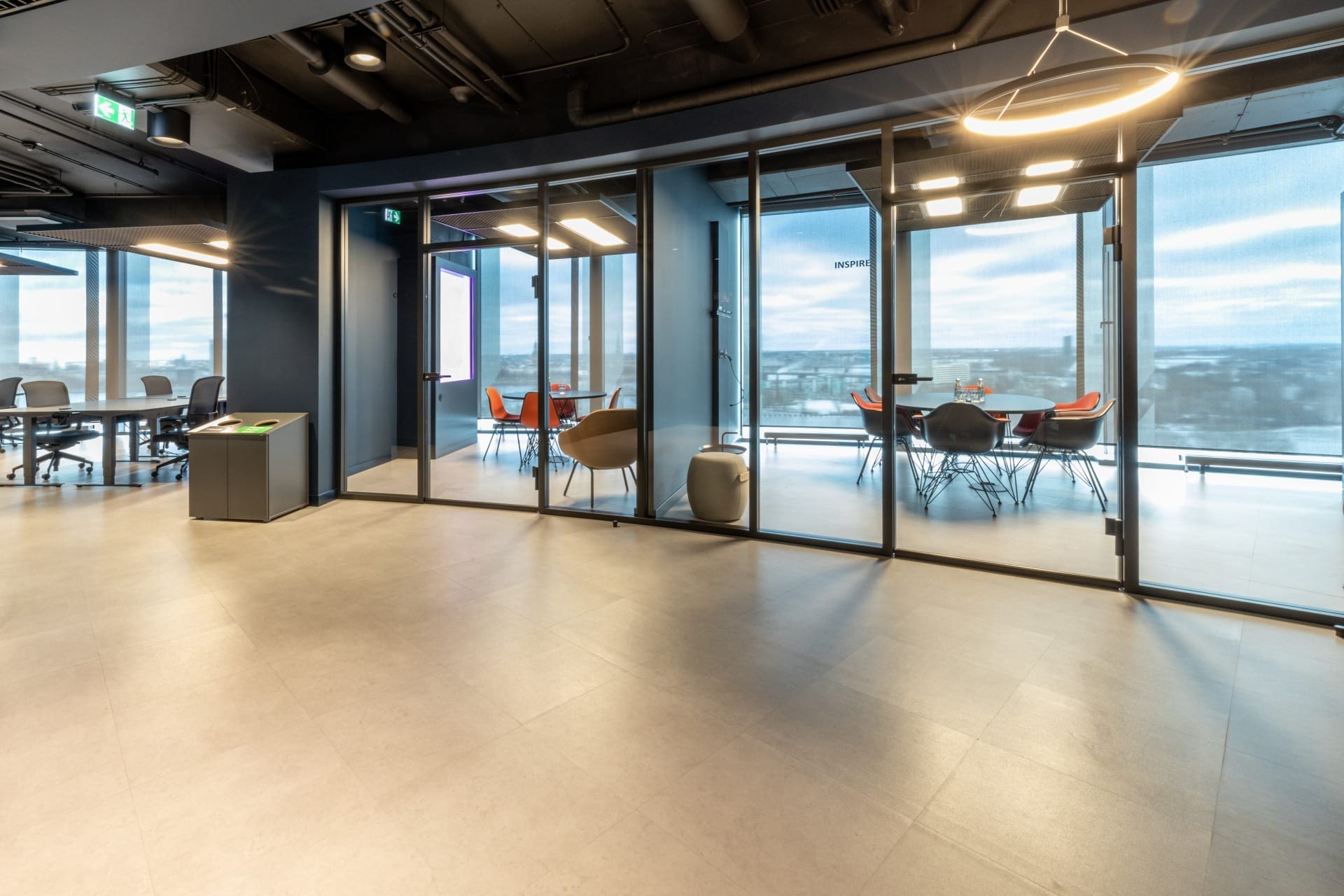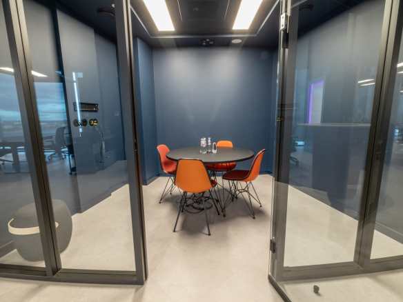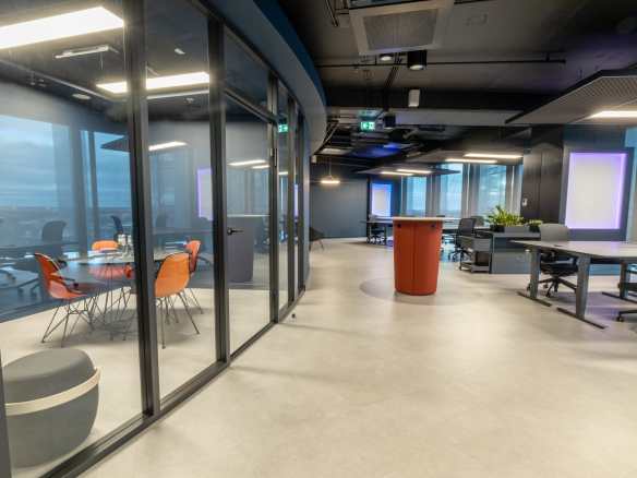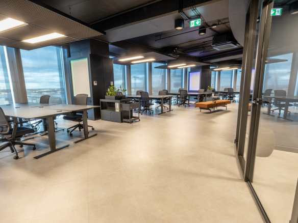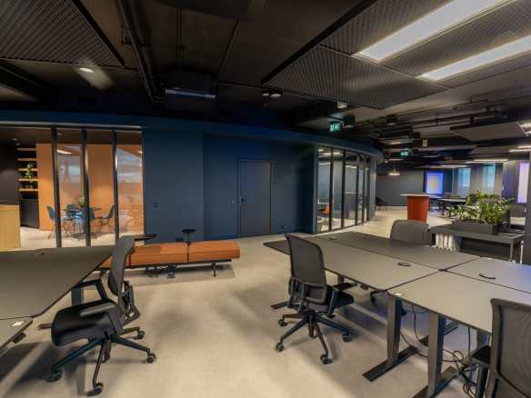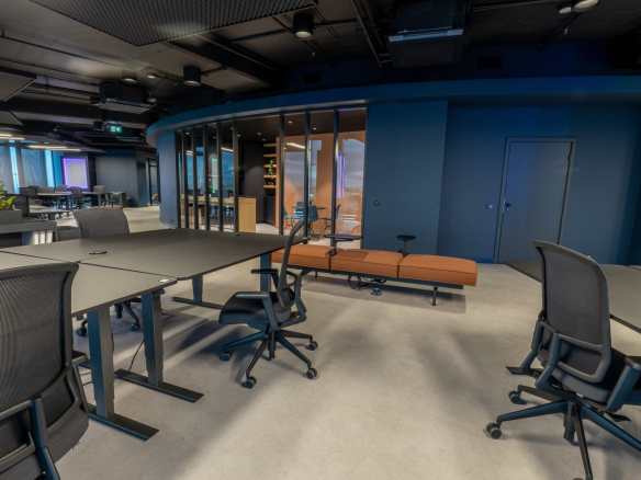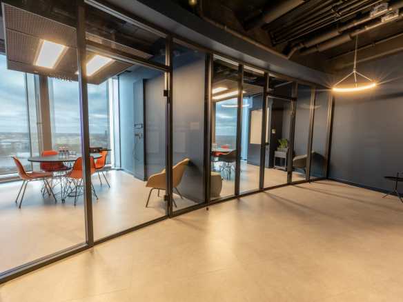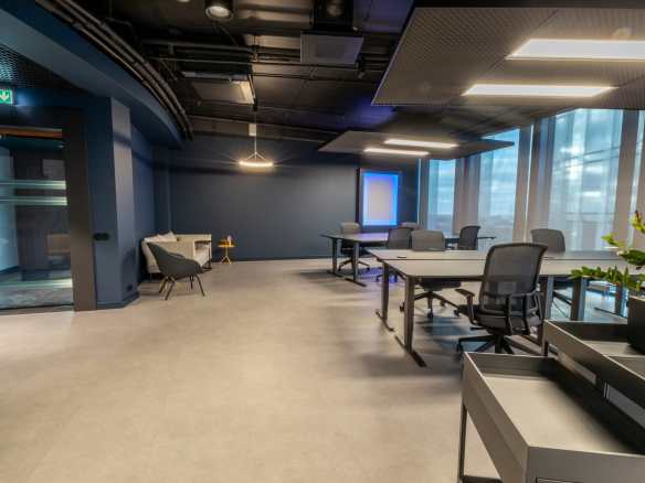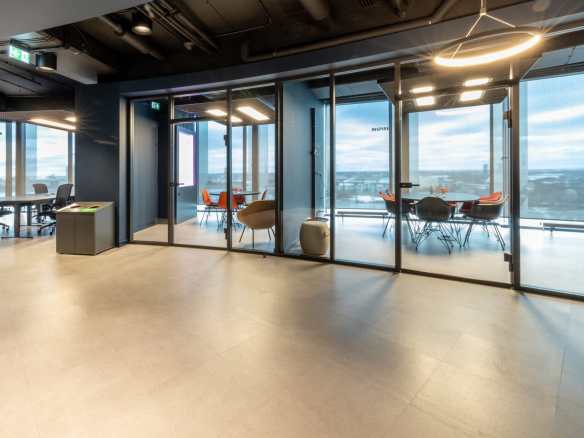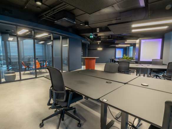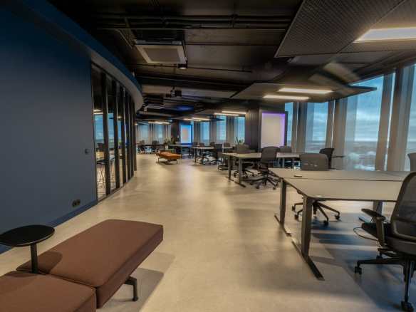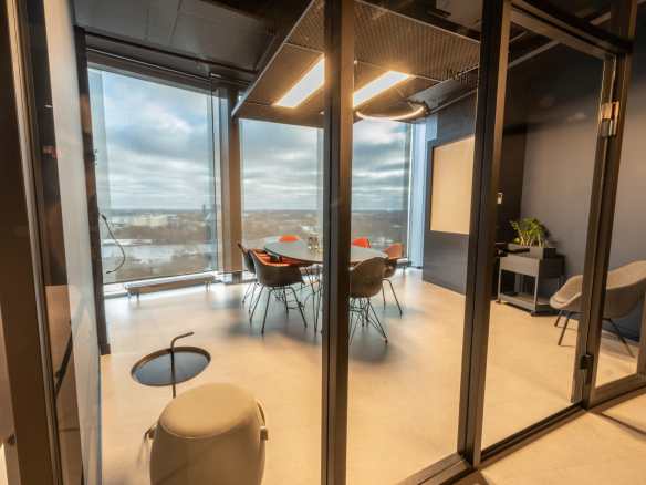 Birojs, kuram ir 393 m² platība, atrodas 11. stāvā un piedāvā skatu uz Vecrīgu. Telpas ir pilnībā mēbelētas un gatavas darbam. Tajā ir trīs atsevišķi kabineti, plašs open space ar ofisa galdiem, divas tualetes un viena liela virtuve.
