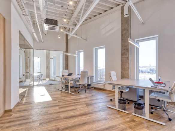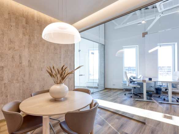 Birojā šobrīd ir pelēkā apdare, bildēs ir redzams kā birojs iskatīsies kad tiks izbūvēts.