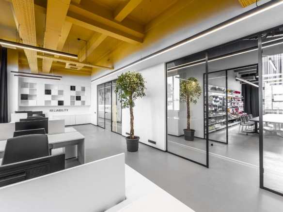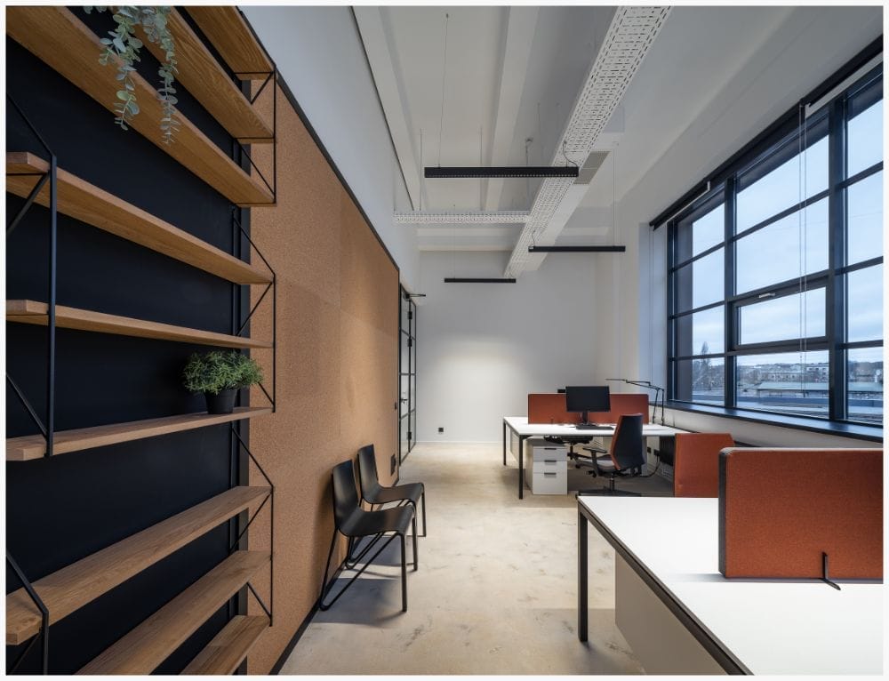 Ēkas dizains ietver slīpētas betona grīdas, lielus logus un industriālu telpu dizainu. Pieejamas dažāda veida telpas – no noliktavām un lieliem, unikāliem ofisiem līdz maziem, jau izveidotiem birojiem.